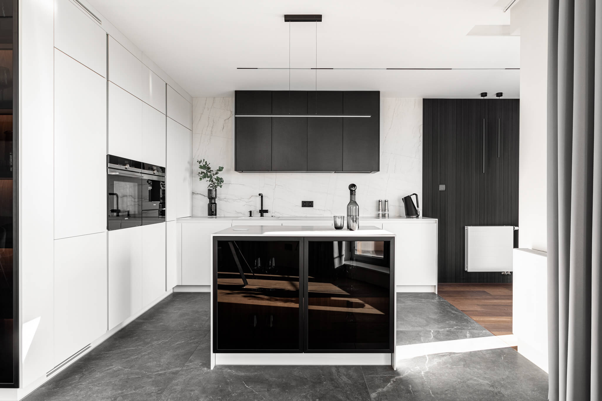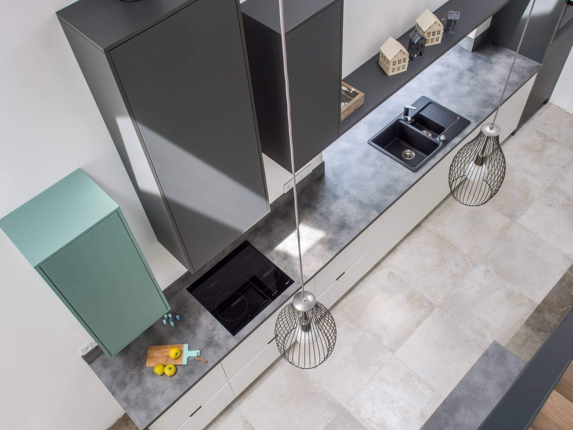 Bardzo elegancką aranżacją białych mebli kuchennych z dodatkiem innej barwy jest wykorzystanie jej przeciwieństwa, czyli czerni. Dwa odmienne od siebie kolory doskonale uzupełniają się, tworząc w kuchni niebywałą aranżację. Tego rodzaju zestawienie najczęściej wykorzystywane jest we wnętrzach nowoczesnych. Zestawienie to jest bowiem bardzo innowacyjne i wprowadza do całej przestrzeni wyjątkowej estetyki. Przykładem takiej kuchni są fronty Satin Surface w kolorze White Chocolate, które zostały urozmaicone o ciemne przody z ciekawą, chropowatą fakturą spieku ceramicznego.