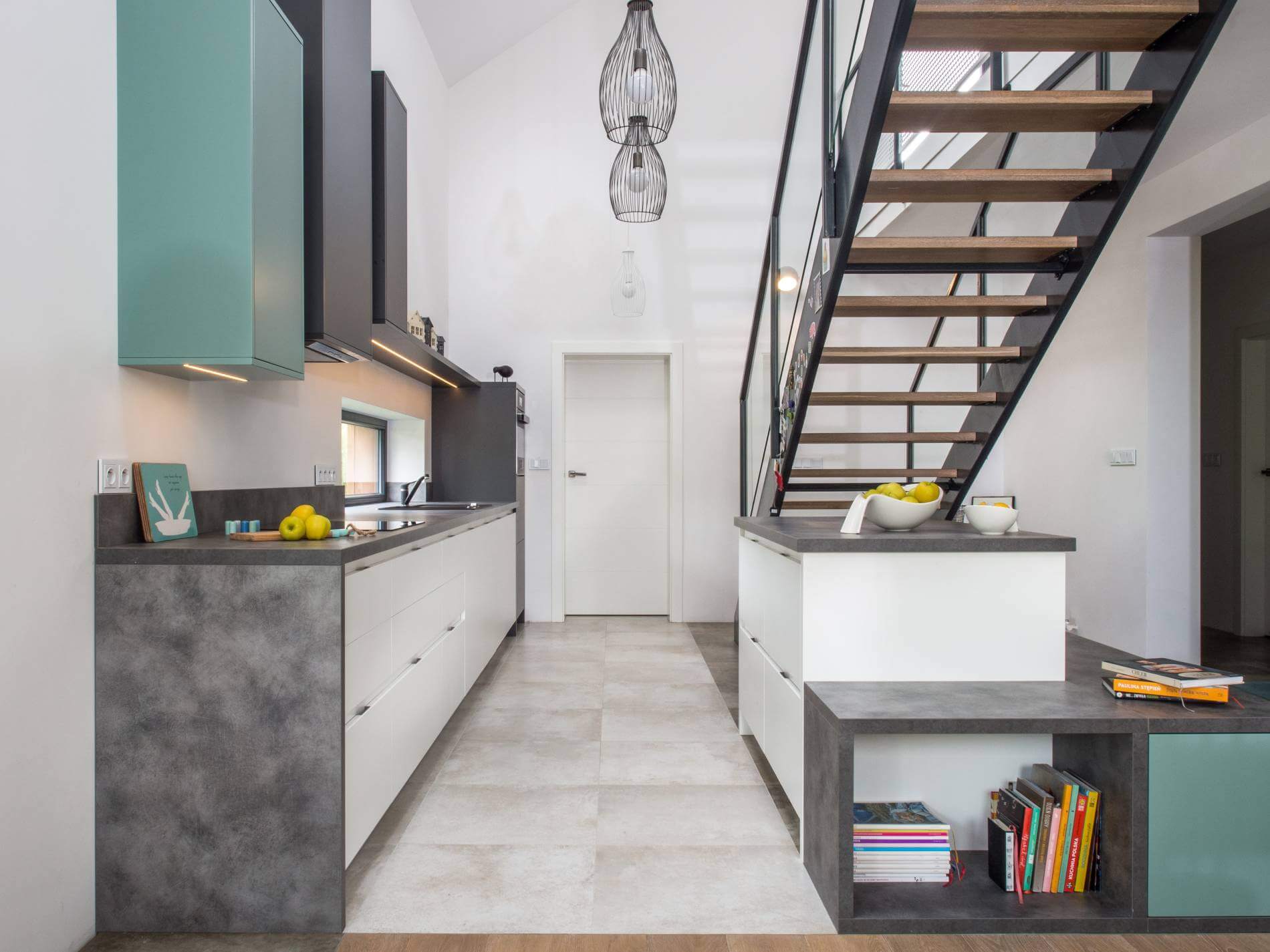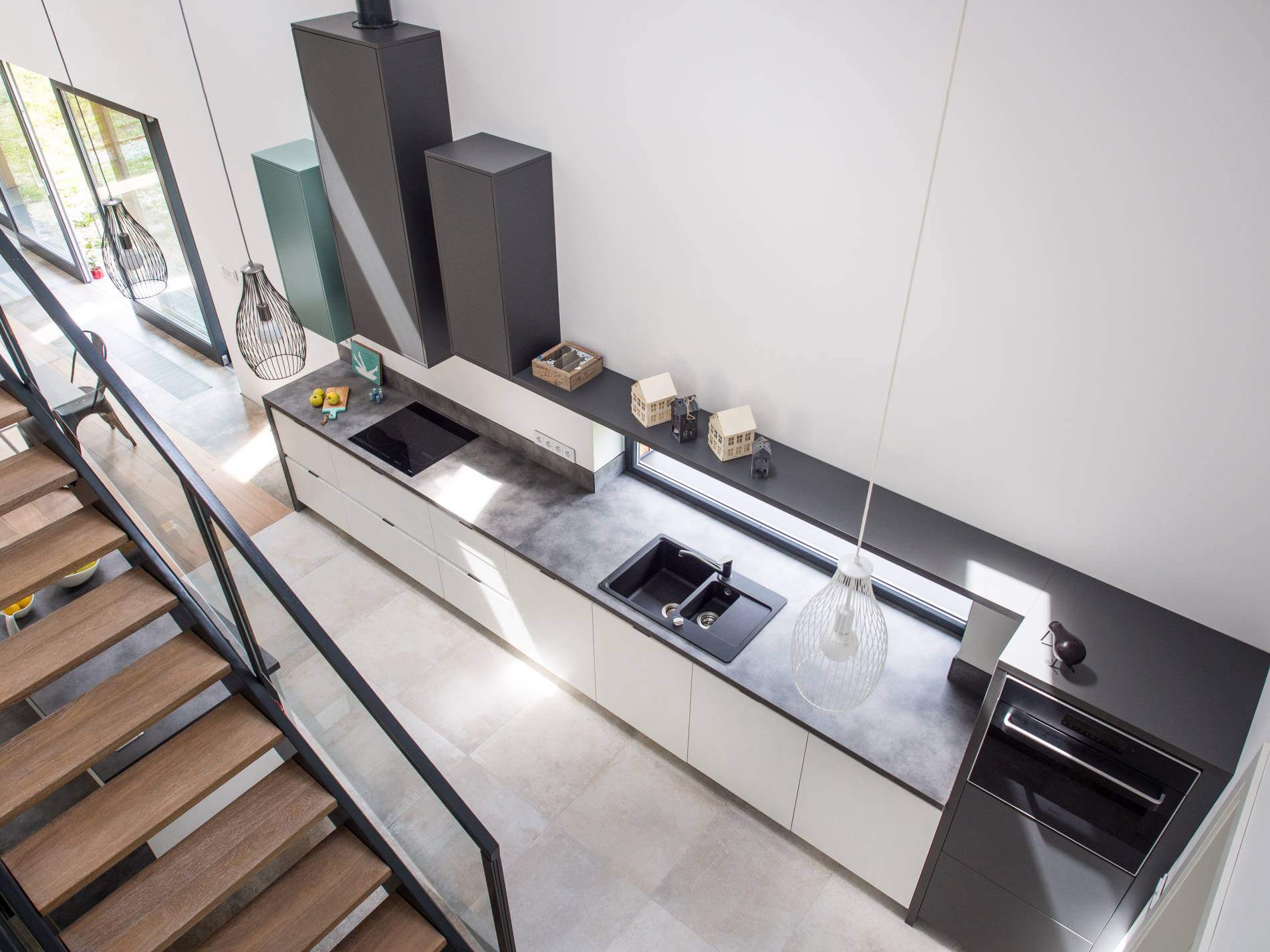 Białe meble kuchenne i szare dodatki