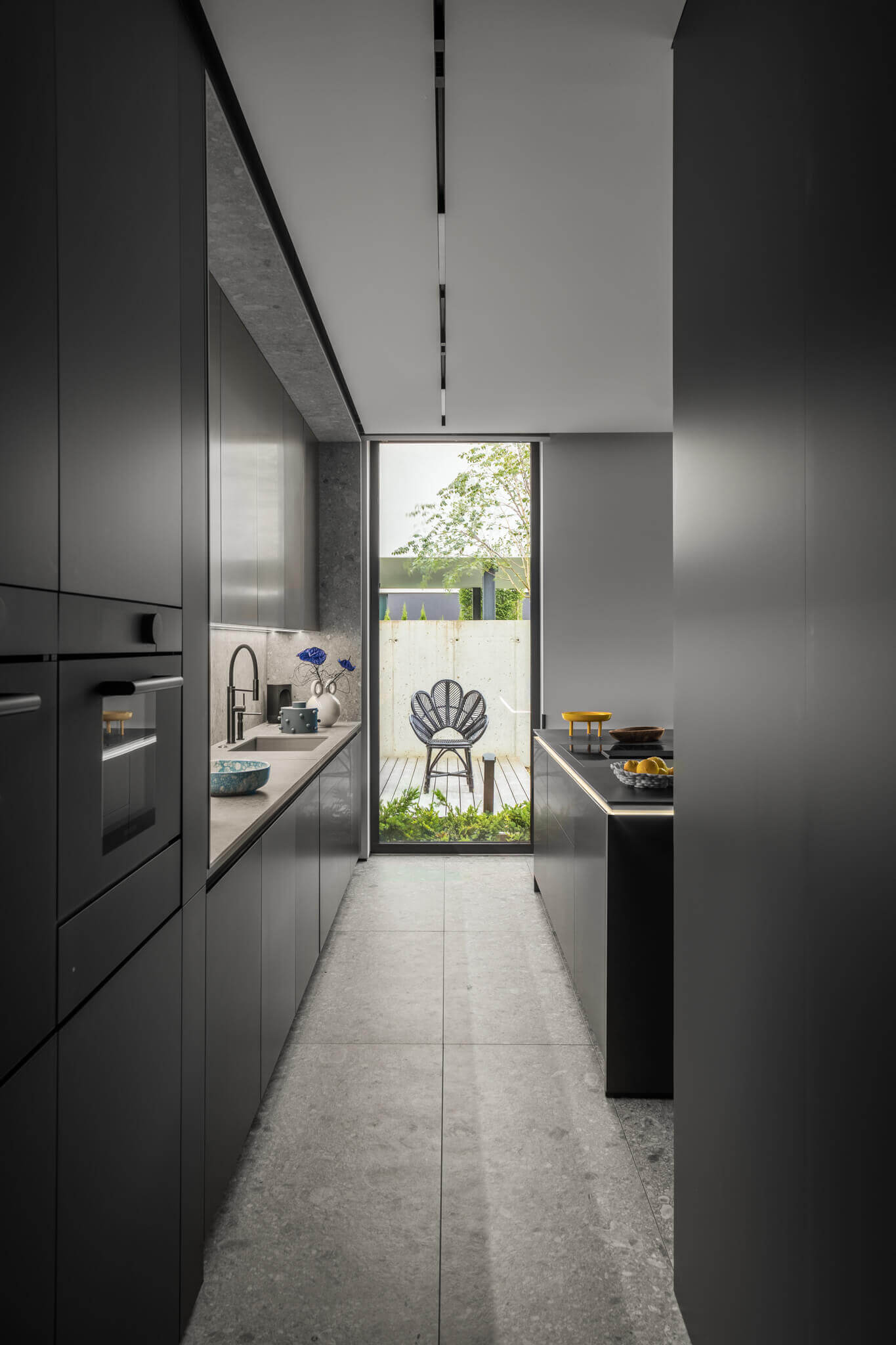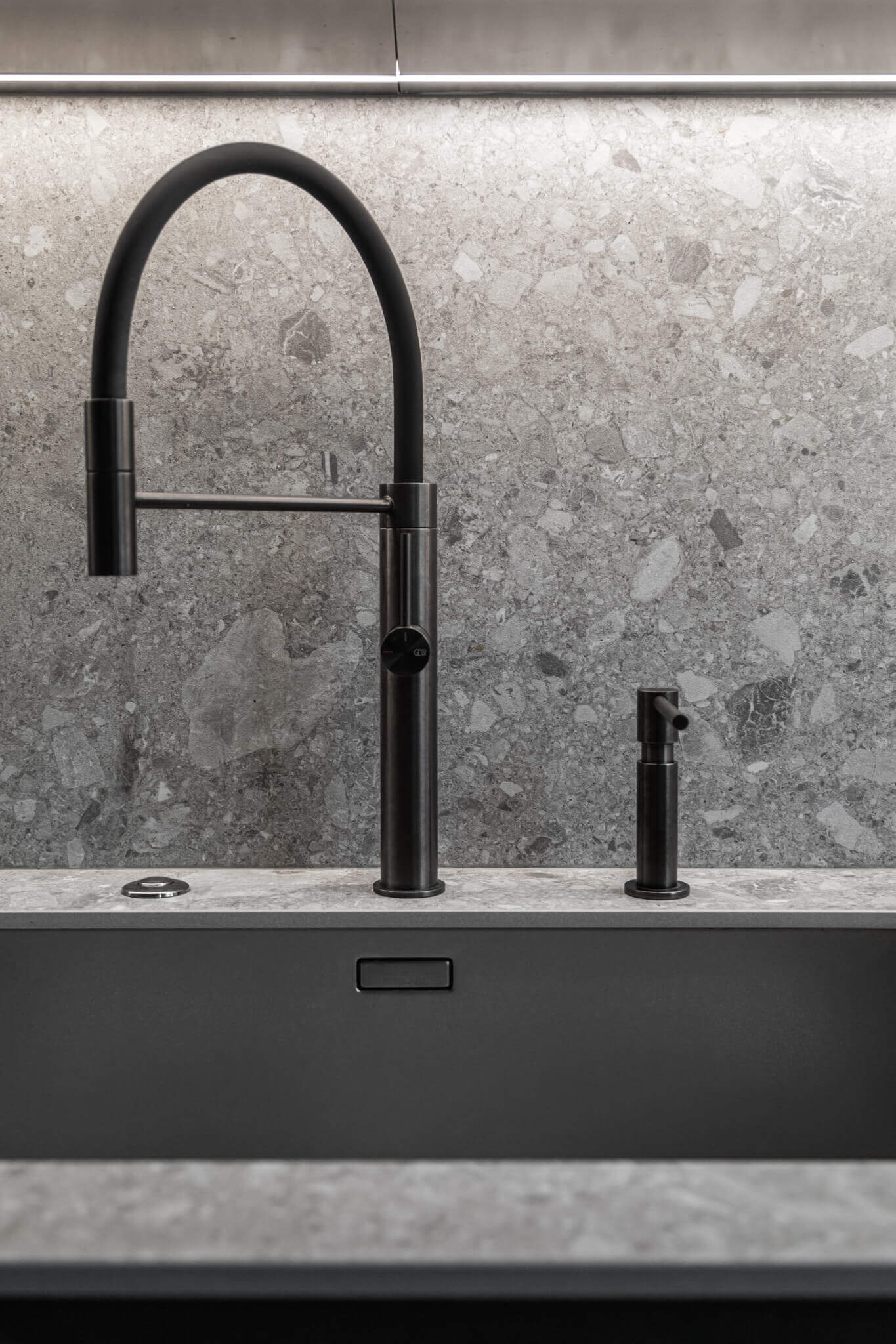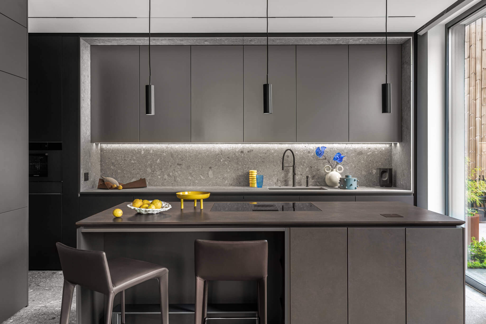 Ciemnoszare, gładkie fronty górnej części zabudowy, tworzą swego rodzaju monolit. Nie jest on jednak obciążający. Ogromnej lekkości dodaje mu nowoczesne podświetlenie na całej długości, a także sąsiedztwo spieku o bardzo oryginalnym wyglądzie. To spiek kwarcowy Dekton hiszpańskiej firmy Cosentino. Nieregularne kształty, różne odcienie jasnoszare dodają pewnej finezji. W tej przestrzeni ukryty jest również ciemnoszary zlew z czarną armaturą. Światło w tej części kuchni dostarcza również ogromne okno, wpuszczające szerokim gestem blaski dnia.