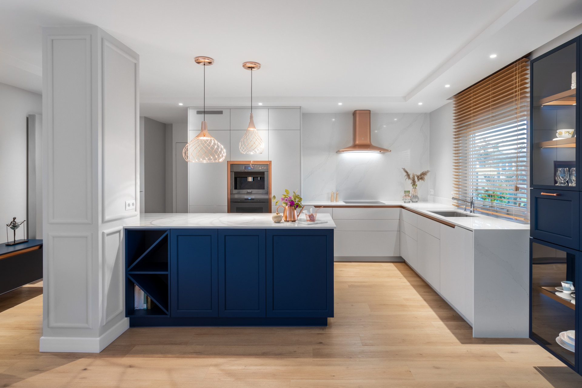 Idealnym rozwiązaniem są zabudowy, które zamiast masywnych szafek posiadają przezroczyste, szklane futryny. Wprowadzają one odpowiednią grę świateł, która dodaje pomieszczeniu charakteru. Aby zrekompensować sobie brak okien, można zastosować ozdobne fronty szafek. Ważne jednak, żeby wzory nie były zbyt przytłaczające. Mogą to być między innymi złote, ryflowane fronty w odcieniu Aurum Light, które zostały wykorzystane w jednej z wcześniejszych realizacji ernestrust. Można ją znaleźć na naszej stronie internetowej pod linkiem: https://rust.pl/kuchnie/wszystkie-kuchnie/program-wzorniczy-s12/.