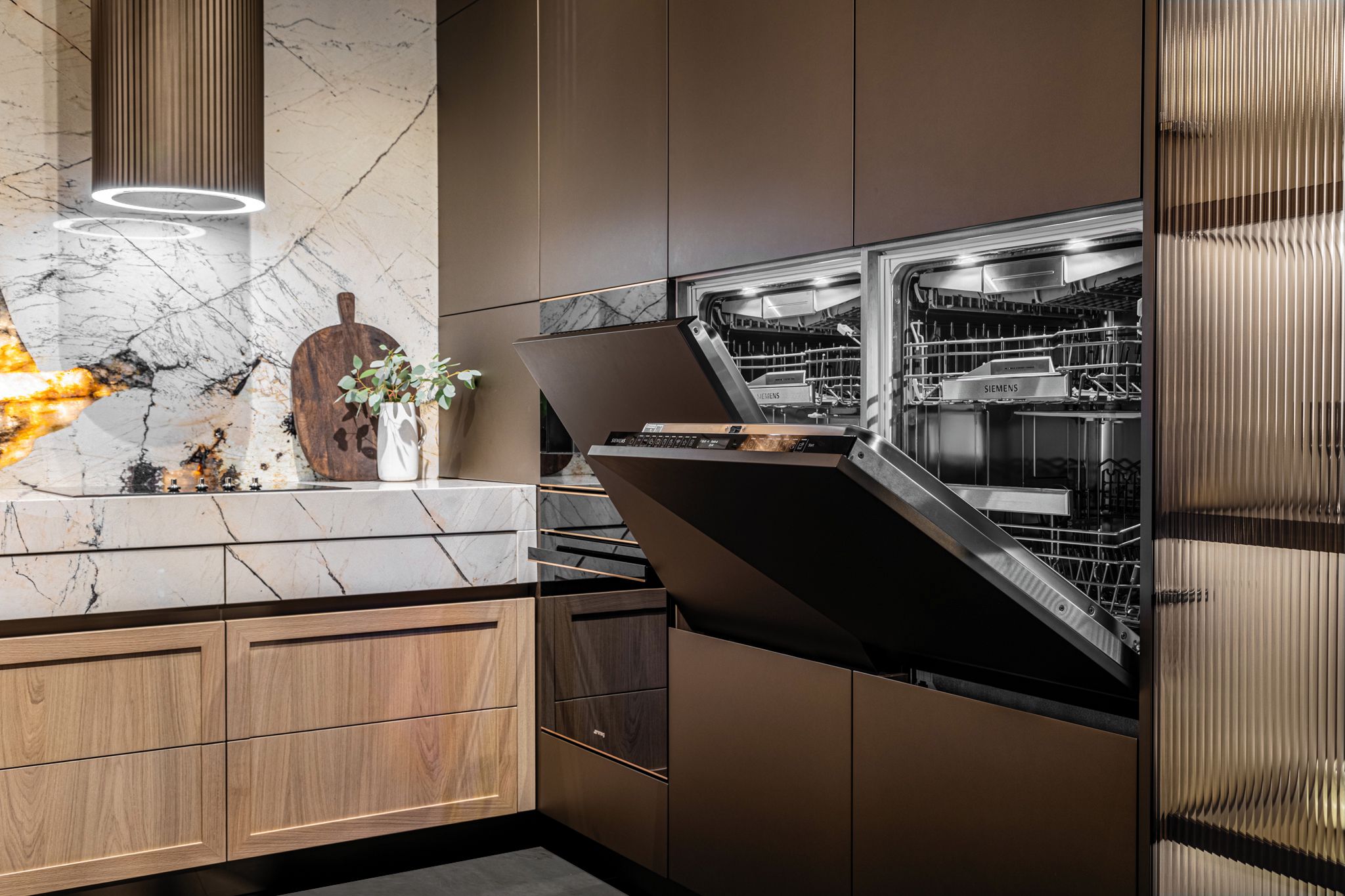 Okap monogram z ryflowaną strukturą w kolorze Bronze i świetlnym ringiem. Sterowany gestami. Kosmos.