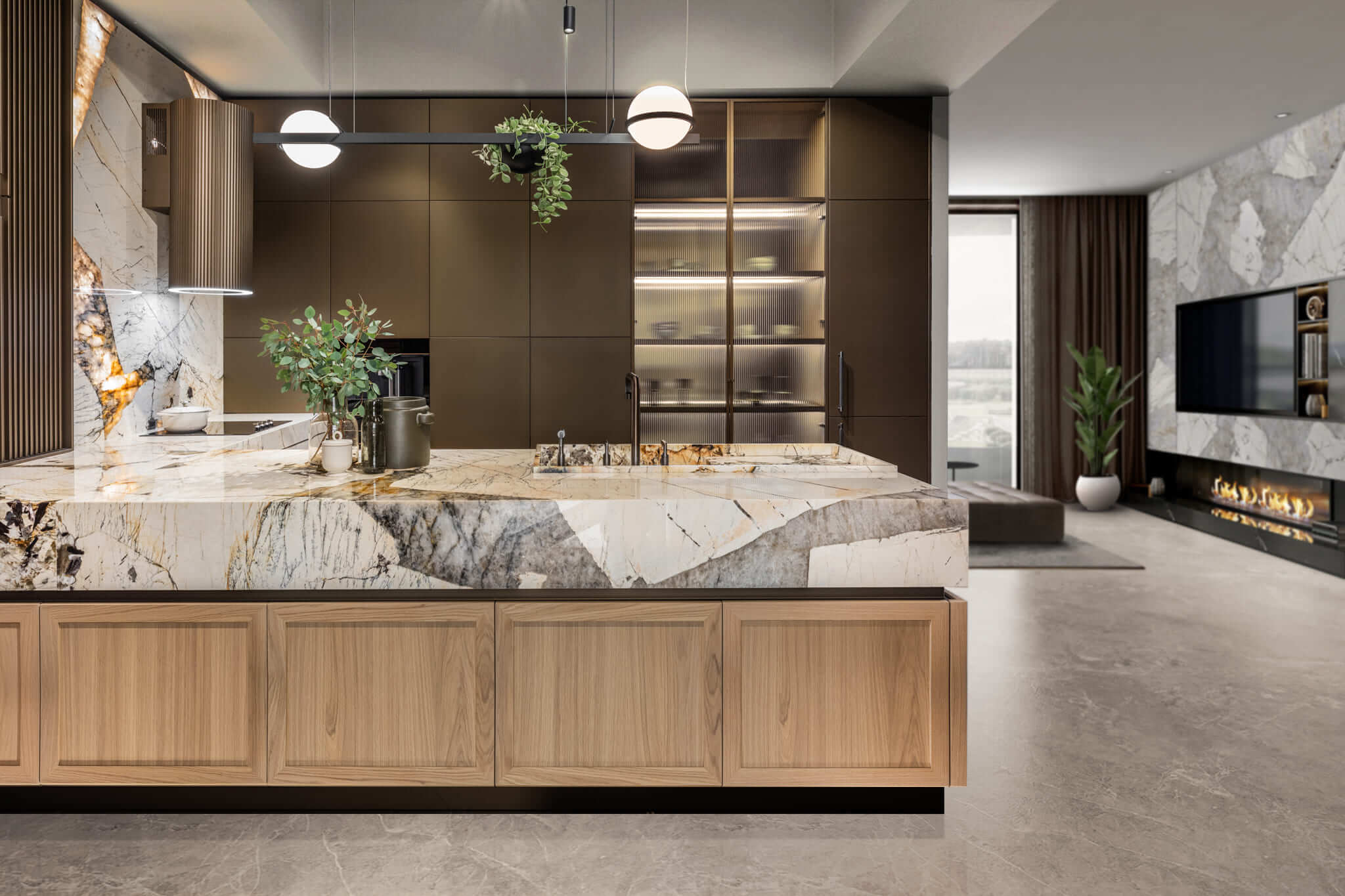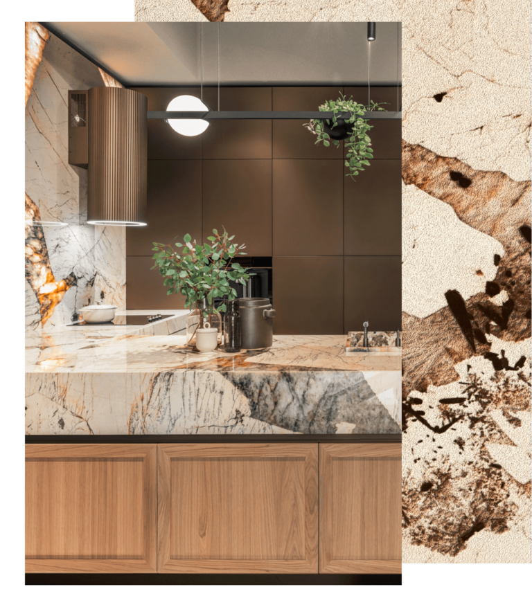 Drewniane szuflady z podświetleniem ukryte za frontami kamiennymi oraz fornirowanym frontem ramiakowym.