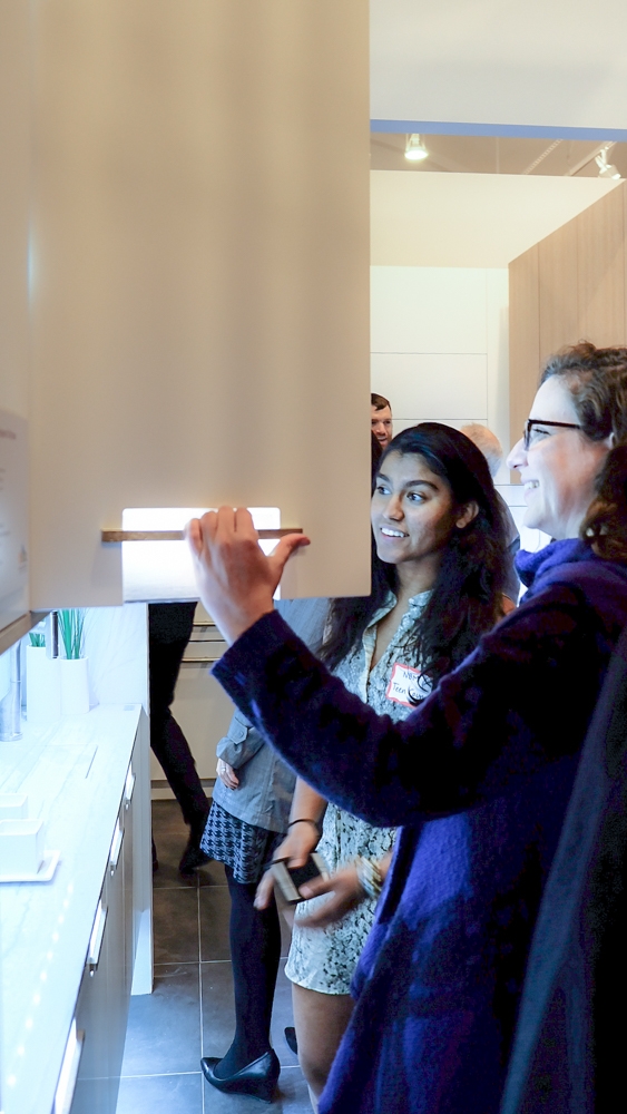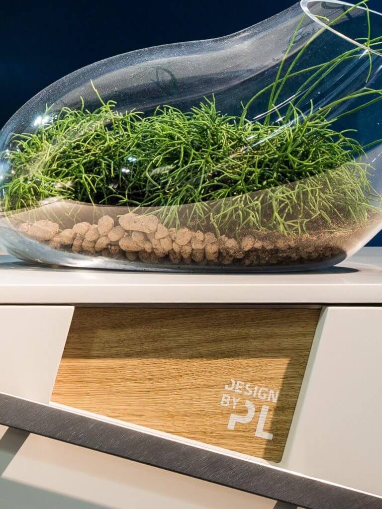 Monolit kuchennej zabudowy jest „rozbity” przez górną część, która całkowicie zdominowana jest przez rozświetlone witryny. W ciepłym, miękkim wręcz świetle niczym drogocenne rzeźby prezentują się… kubki, talerze, miski. Każdy ruch sprawia, że w kuchni pojawiają się radosne bliki odbitego światła wpadającego przez okna. Ta część dodaje lekkości, figlarności stonowanej kompozycji.