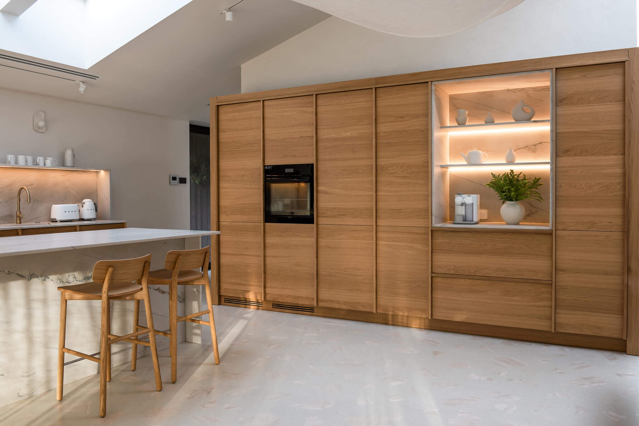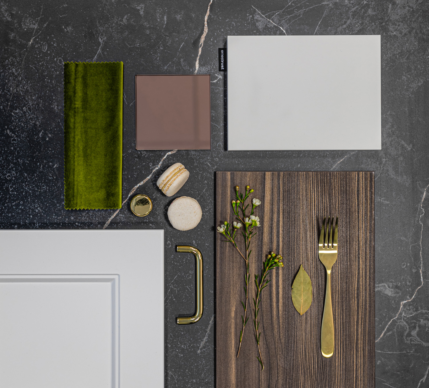 Kuchnia utrzymana jest w kolorach ziemi. Ciepły brąz na frontach, niejednolita biel na blatach (wzór spieku Laminam – imitacja marmuru Calacatta Oro Venato z kolekcji I NATURALI), przyjemna naturalność drewna kolumnowej zabudowy. I choć poszczególne elementy tej układanki mocno ze sobą kontrastują – pozostają w ciepłych wariantach kolorystycznych tworząc przytulną, domową przestrzeń.